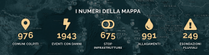 Le 11 perturbazioni transitate in novembre sono state appena sufficienti a dare origine a un accumulo medio vicino alla norma, solo leggermente più contenuto (-4%), a livello nazionale. Le elaborazioni evidenziano quantitativi inferiori alla media, compresi fra -13% e -15%, al Nord-Ovest, al Centro e in Sicilia, nella media al Nord-Est e in Sardegna, superiori alla media (+21%) al Sud. Fra le varie fasi di maltempo, ve ne sono state almeno cinque di un certo rilievo, di cui una, fra il giorno 15 e il 17, molto intensa con accumuli estremi in particolare su Liguria, alta Toscana, Apennino settentrionale e Friuli Venezia Giulia, associata anche a criticità (tornado e danni nel Genovese e alluvione in provincia di Gorizia).