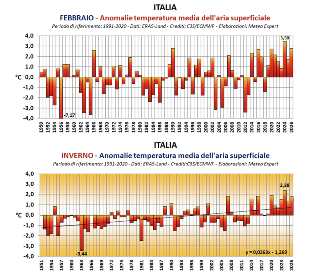 Tornando ai non-inverni dei giorni nostri, tra miti correnti occidentali e meridionali, rimonte anticicloniche di matrice sub-tropicale e non più di due settimane di freddo artico, la stagione meteorologica 2025/26 si è chiusa con un’anomalia termica di +1,79°C e il quarto posto del ranking degli inverni più caldi dal 1950, dietro alle stagioni 2015/16 e 2006/07 (+1,84°C), all’inverno 2019/20 (+1,89°C) e all’inverno record 2023/24 (+2,38°C).