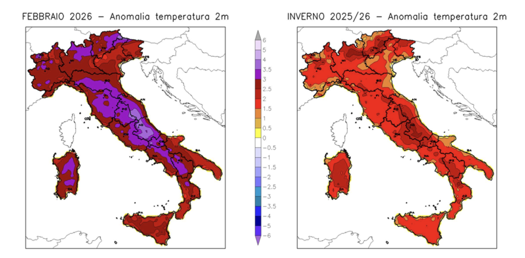 La distribuzione sul territorio italiano delle anomalie termiche di febbraio 2026 e dell’intero inverno meteorologico evidenzia temperature medie mensili e stagionali abbondantemente superiori alla media in tutto il Paese, soprattutto in gran parte delle Alpi, lungo la dorsale appenninica e nelle zone interne della Sardegna, aree dove lo scarto dalla media ha superato i 3°C in febbraio. Non stupirà dunque apprendere che la Sardegna e la Sicilia hanno sperimentato il loro secondo mese di febbraio più caldo dalla metà del secolo scorso, così come l’intera stagione invernale, le regioni centrali il terzo febbraio più caldo (anomalia +3,08°C), il Nord e il Sud peninsulare il quarto più caldo, con anomalie di +2,75°C e +2,63°C, rispettivamente.