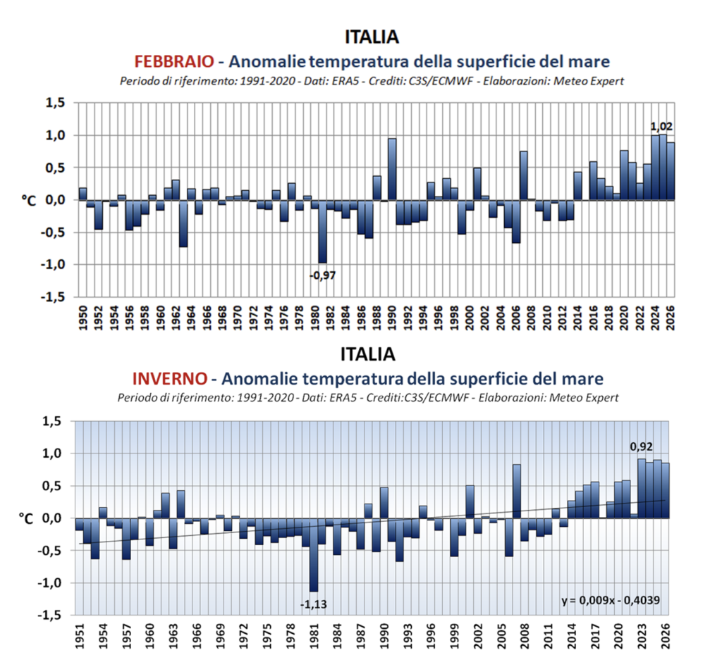 L’anomalia dell’intera stagione meteorologica (1 dicembre 2025 – 28 febbraio 2026) è stata di poco inferiore a quella di febbraio: con +0,86°C, l’inverno da poco concluso si è posizionato al terzo posto del ranking delle stagioni invernali più calde per il mare degli ultimi 76 anni, a pari merito con l’inverno 2023/24 e dietro alle stagioni meteorologiche 2024/25 e 2022/23 (record con +0,92°C).
