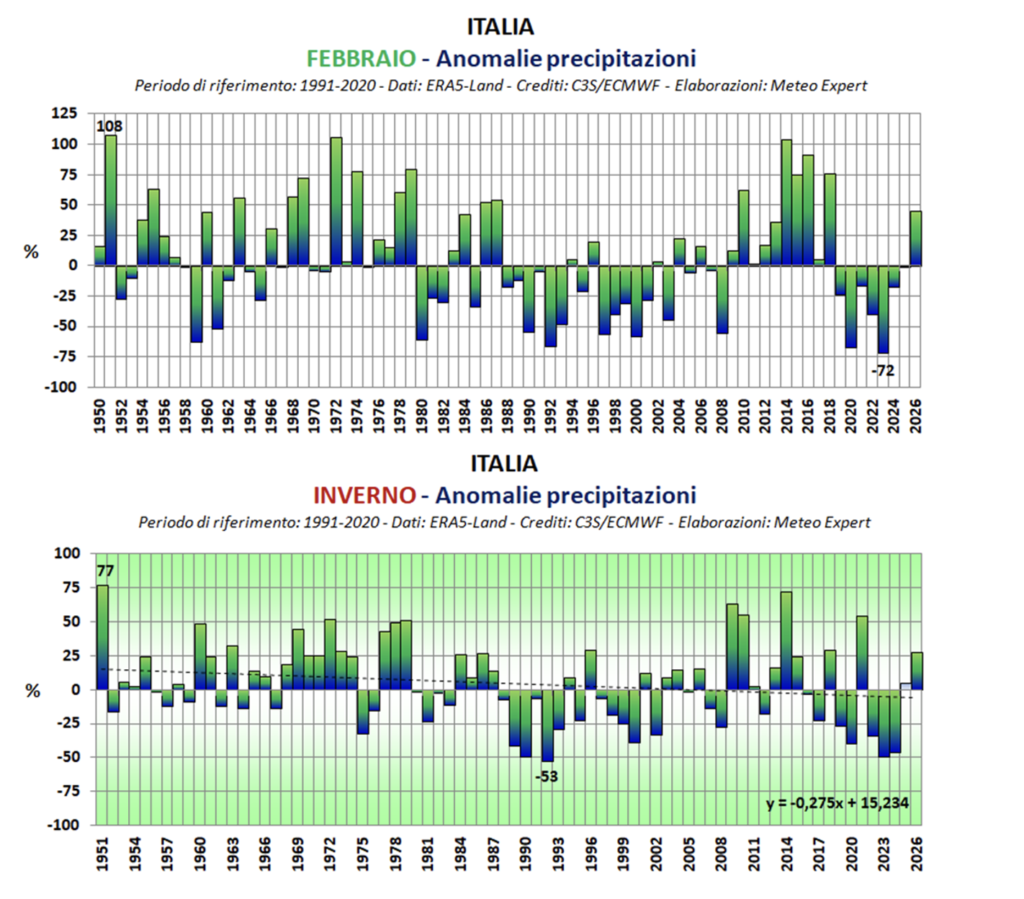 Secondo i dati ERA5-Land di Copernicus, in febbraio è caduto sull’Italia il 45,2% di precipitazione in più rispetto alla media del trentennio 1991-2020: un surplus pluviometrico dopo sette anni consecutivi di deficit (con record di -72% nel 2023), che pone l’ultimo mese dell’inverno al diciassettesimo posto della classifica dei mesi di febbraio più umidi dalla metà del secolo scorso. L’intero inverno si è chiuso al sedicesimo posto del ranking stagionale, con un surplus complessivo del 27%, frutto di un dicembre secco in quasi tutta l’Italia, di un gennaio estremamente generoso di precipitazioni al Centro Sud e di 11 perturbazioni transitate sull’Italia nelle prime tre settimane di febbraio, tra le quali le tempeste Marta, Oriana (la tempesta di San Valentino) e Pedro.
