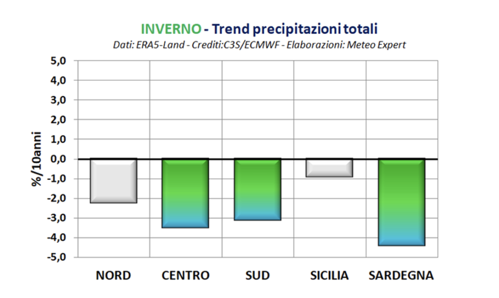 Tra il 1951 e il 2026, la quantità di precipitazione caduta sull’Italia durante la stagione invernale ha subito una diminuzione di quasi il 3% ogni 10 anni. Tuttavia, il trend a livello nazionale non è statisticamente significativo, quindi non si può escludere che sia dovuto solo al caso. Se invece consideriamo i singoli settori geografici del nostro Paese, Nord, Centro, Sud peninsulare, Sicilia e Sardegna, scopriamo un trend negativo statisticamente significativo per le regioni centrali, il Sud peninsulare e la Sardegna, particolarmente accentuato per quest’ultima, che ha sperimentato una diminuzione della quantità di precipitazione di oltre il 4% ogni 10 anni.