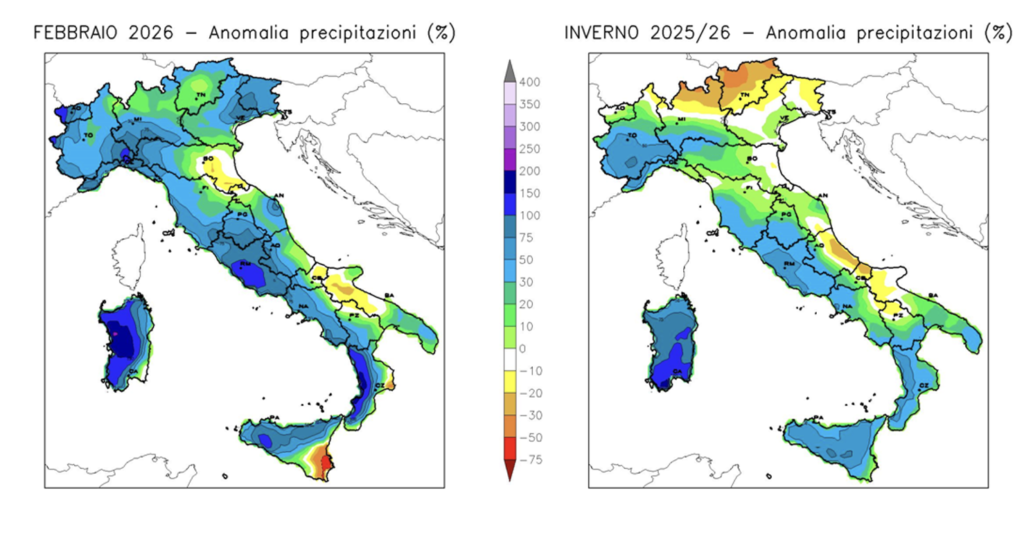 Le mappe delle anomalie pluviometriche di febbraio 2026 e dell’intera ultima stagione invernale mostrano chiaramente la situazione in contro-tendenza di quest’anno, caratterizzata da un eccesso di precipitazione in quasi tutto il Paese in febbraio, al Nordovest, sull’Alto e Medio versante tirrenico, al Sud e nelle Isole su base stagionale.