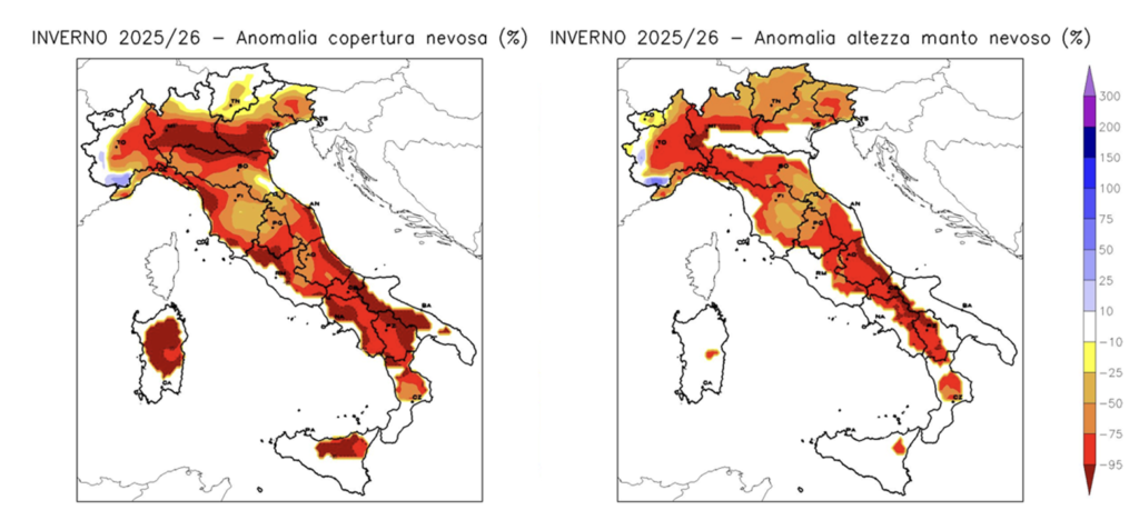 La Pianura Padana, un tempo imbiancata da qualche nevicata, quest’inverno è rimasta completamente a secco, se si escludono gli episodi occorsi in Piemonte, in Emilia e in Romagna, comunque non sufficienti da ricordarci com’erano gli inverni di pochi decenni fa. Situazione drammatica sull’Appennino, che neppure alle quote più elevate ha potuto sperimentare una copertura ed una altezza del manto nevoso adeguate alla stagione. Nelle Isole la neve ha imbiancato prevalentemente solo le cime più elevate, dove la copertura e lo spessore del manto nevoso sono comunque risultati ben inferiori al valore medio stagionale.