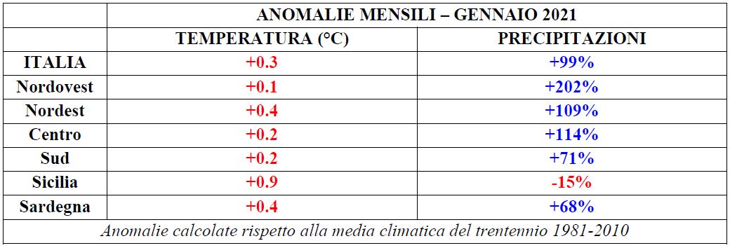 Dopo un dicembre 2020 che ha portato sull’Italia il doppio delle piogge tipiche del mese, infatti, anche il clima di gennaio è stato caratterizzato da precipitazioni particolarmente abbondanti. Il bilancio pluviometrico del mese è infatti del tutto simile a quello di dicembre, con un +99% rispetto alla media del trentennio 1981-2010: con questo dato il gennaio 2021 si piazza al sesto posto tra quelli più piovosi che siano stati registrati dal 1959.