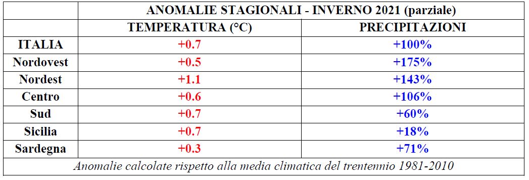La stagione invernale sta procedendo all’insegna delle piogge abbondanti che hanno caratterizzato in maniera simile i primi due mesi. Infatti, complessivamente ha piovuto il doppio rispetto alla media, con gli esuberi più significativi al Nord (+175% al Nord-Ovest, +143% al Nord-Est), seguiti dal Centro (+106%) e dalle regioni meridionali (+60% al Sud, +18% in Sicilia, +71% in Sardegna). Sottolineiamo che è solo parziale, ma al momento l’anomalia della stagione in corso (+100%) rappresenta una delle più elevate della serie storica dal 1959.