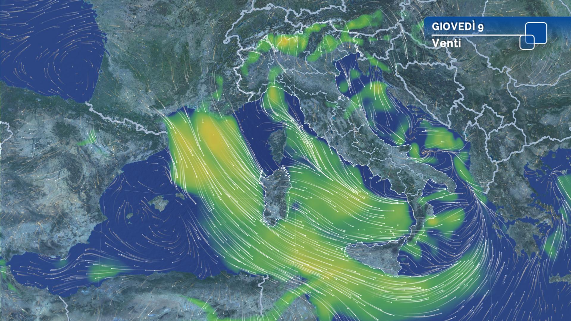 Giornata ventosa per venti settentrionali: da moderati a tesi sull’alto Adriatico, in Liguria e al Centro-Sud; fino a forti su Adriatico centrale, basso Tirreno, Sicilia, inizialmente anche sulla Sardegna. Föhn nelle vallate alpine.