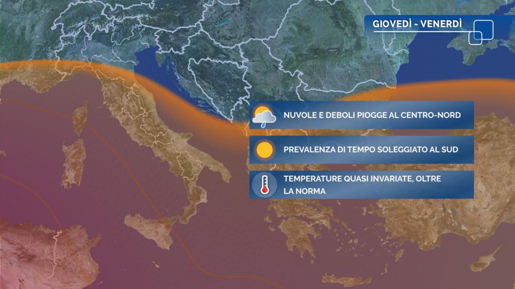 Quella di giovedì sarà una giornata abbastanza soleggiata con cielo in prevalenza poco nuvoloso o velato lungo il medio e basso mare Adriatico, in Basilicata, sulla Calabria e sulle Isole maggiori; nel primo mattino possibili nebbie o nubi basse nel Lazio e sulla Puglia meridionale. Parzialmente nuvoloso con qualche temporanea schiarita nel settore tirrenico tra la bassa Toscana e il Cosentino, sull’estremo Ponente ligure, nell’ovest del Piemonte e lungo le Alpi centro-occidentali.